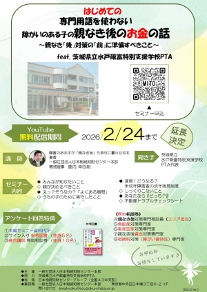 受付中セミナー情報WEBセミナー 【延長決定!】はじめての 専門用語を使わない 障がいのある子の親なき後のお金の話feat.水戸飯富特別支援学校